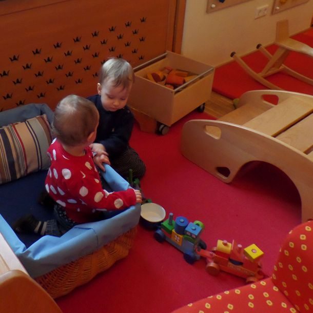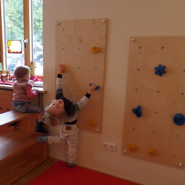 Die Gestaltung der Räume und das Platzangebot ist konsequent auf die besonderen Bedürfnisse der Kleinkinder abgestimmt, die mehr Platz zu ihrer Bewegungsentwicklung benötigen als ein Kindergartenkind. Qualität und Umfang der Ausstattung sind so gewählt, dass die weitere Entwicklung der Kinder gut darauf aufbauen kann. Sicherheit und Überschaubarkeit spielen bei der Gestaltung eine tragende Rolle.