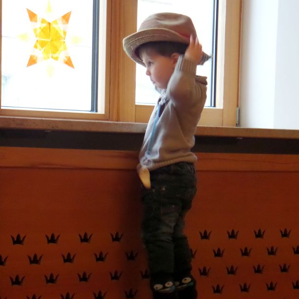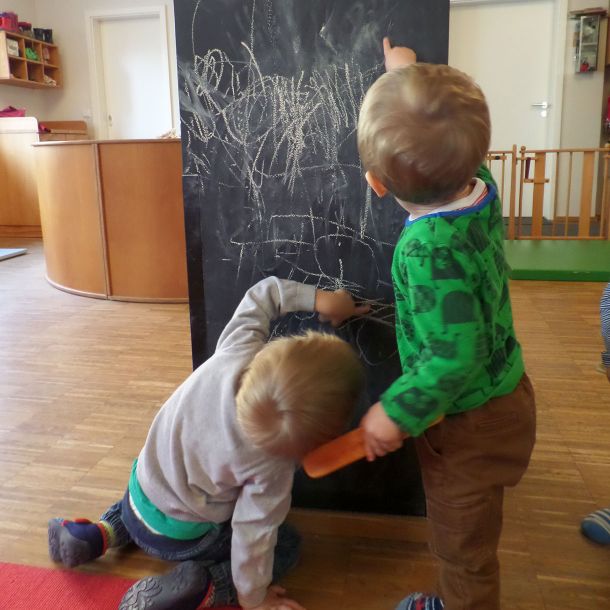 Eine Säule mit Tafelfarbe lädt zum Malen ein. Kleine, standfeste Regale ordnen und strukturieren den Raum. Mit natürlichen Materialien wird ein warme Athmossphäre geschaffen. Die Räume sind so gestaltet, dass die Kinder die Erwachsenen bei ihren zweckgerichteten Tätigkeiten beobachten und selbst aktiv werden können.