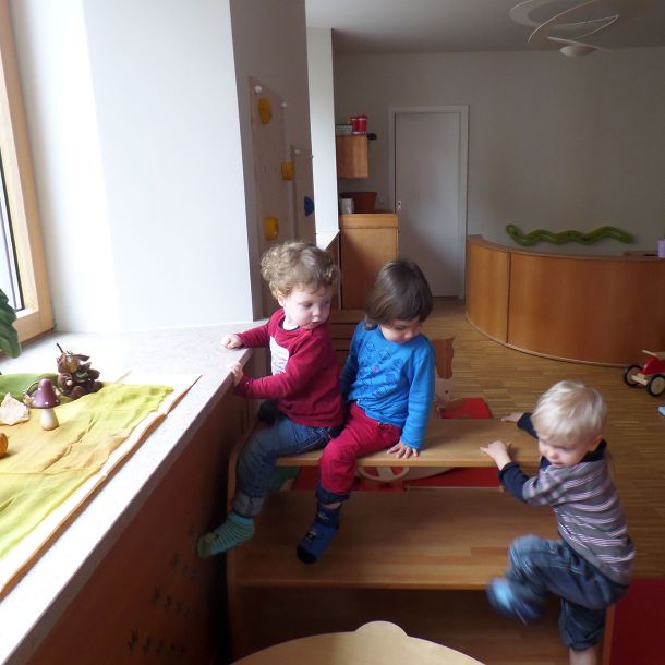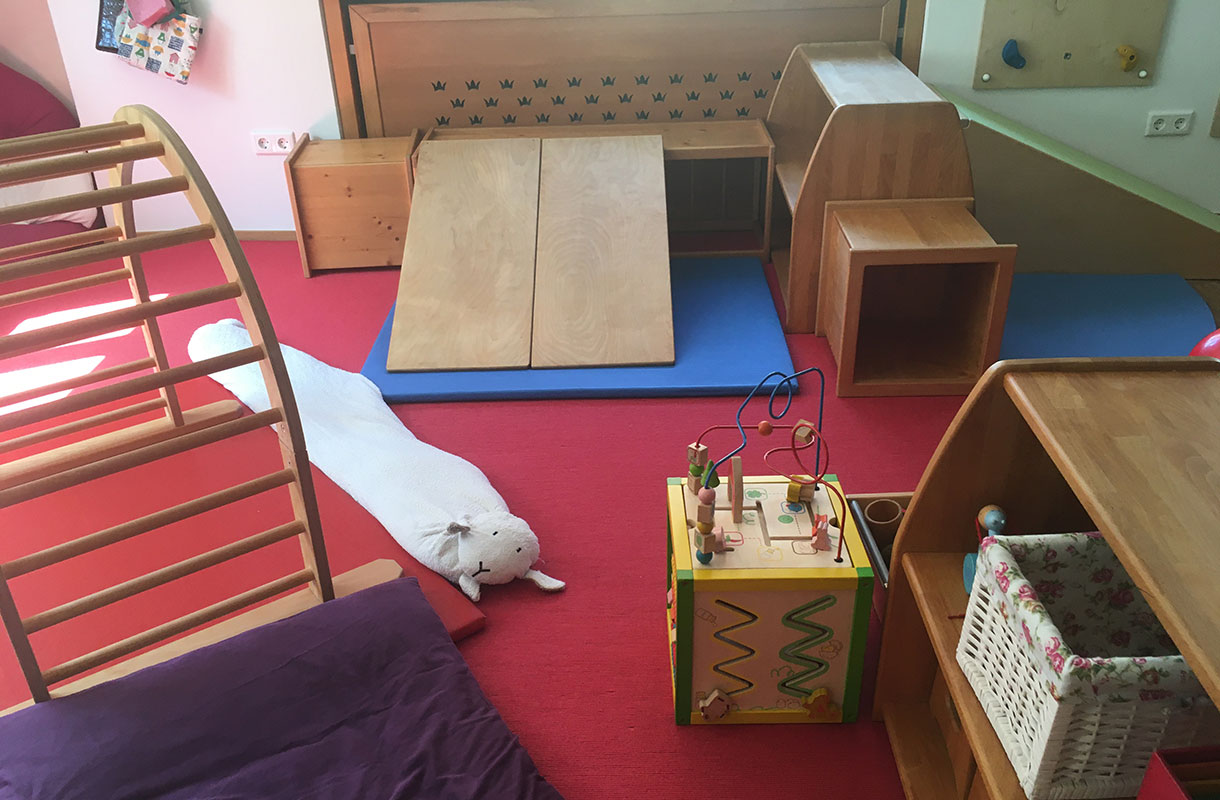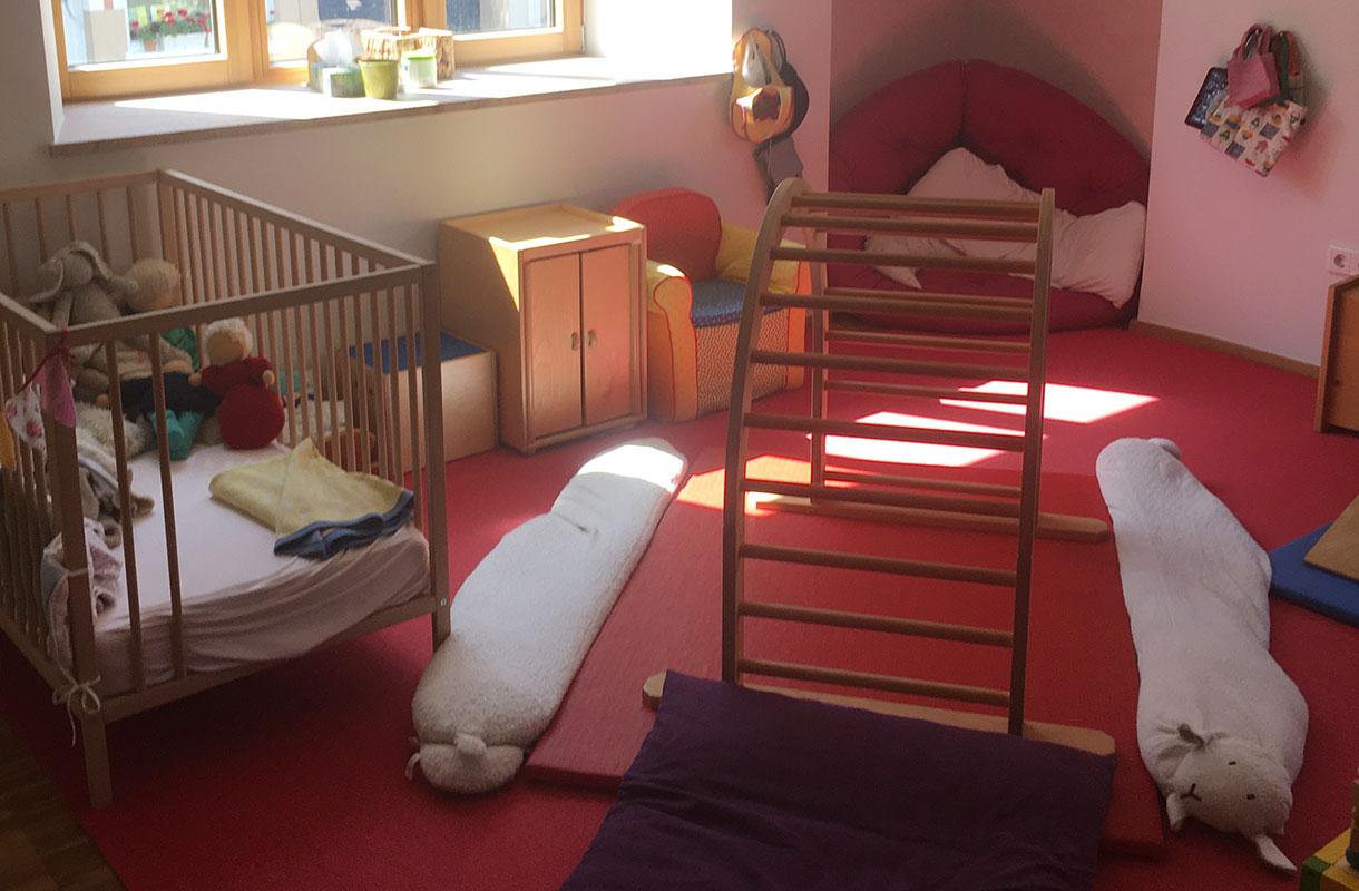 Die Gestaltung der Räume und das Platzangebot ist konsequent auf die besonderen Bedürfnisse der Kleinkinder abgestimmt, die mehr Platz zu ihrer Bewegungsentwicklung benötigen als ein Kindergartenkind. Qualität und Umfang der Ausstattung sind so gewählt, dass die weitere Entwicklung der Kinder gut darauf aufbauen kann. Sicherheit und Überschaubarkeit spielen bei der Gestaltung eine tragende Rolle.