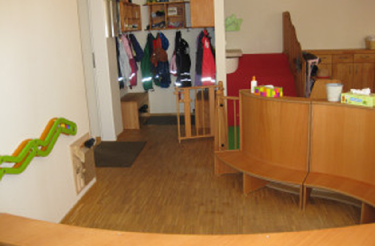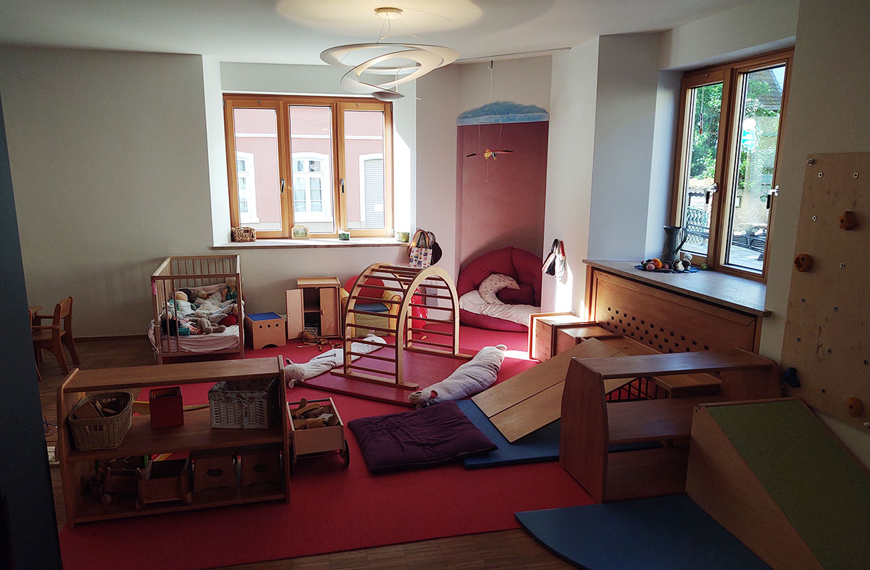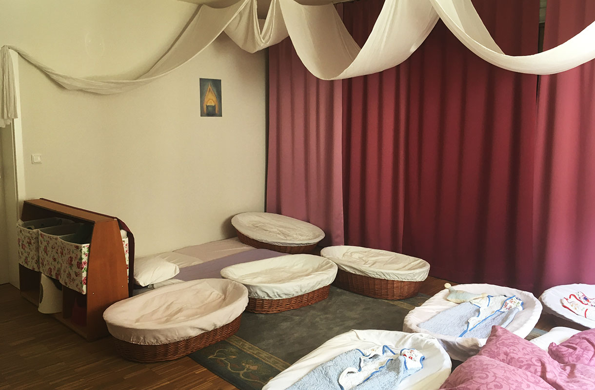 Im angrenzenden Schlafzimmer mit Wickelbereich hat jedes Kind sein eigenes Schlafkörbchen, in das es selbstständig ein- und aussteigen kann. Die Kinder sollen sich wohlfühlen und entspannt schlafen können. Die Körbchen stehen nebeneinander im Halbkreis überdacht von einem " Himmel" aus Stoff. In der Einschlafphase sind die Betreuerinnen dabei auf eigenen Schlafmatten, sodass sich jedes Kind aufgehoben und wahrgenommen fühlt.