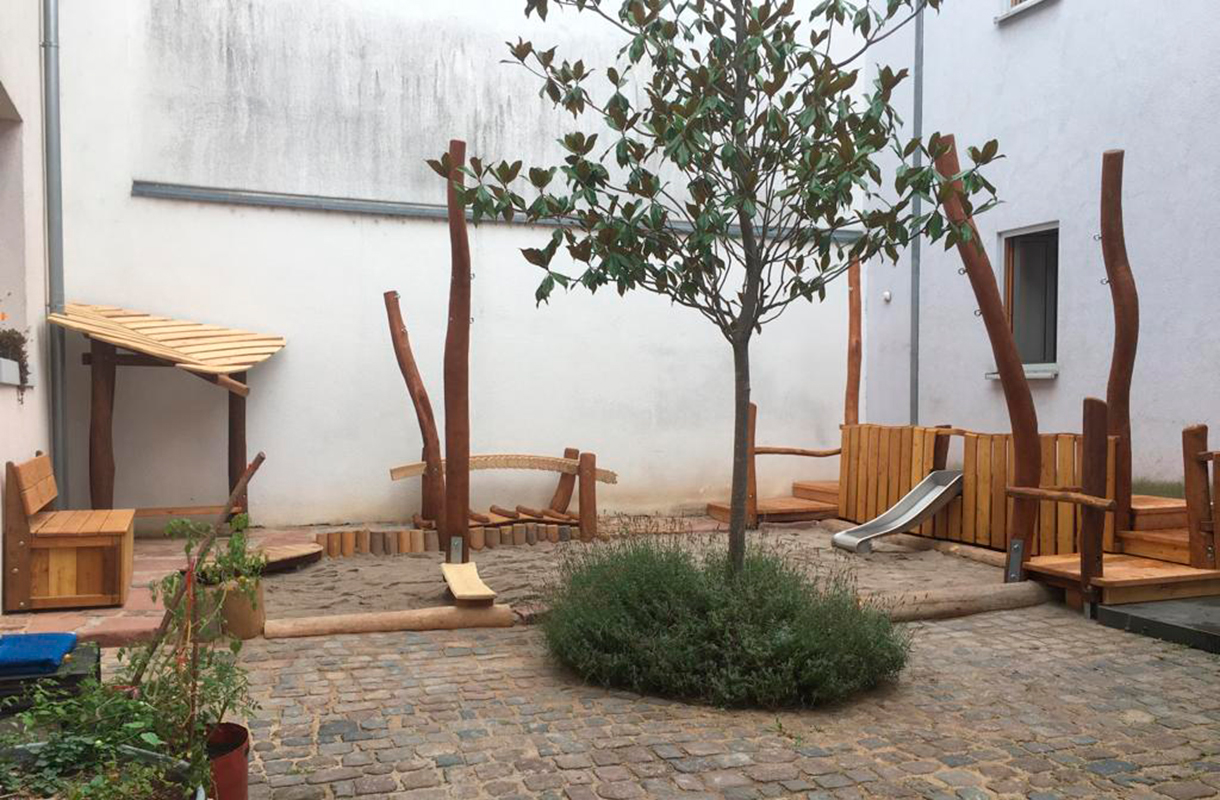 Einen Teil ihrer Betreuungszeit spielen die Kinder täglich fast unabhängig vom Wetter in dem im Sommer 2019 neu gestalteten Innenhof ausgestattet mit Sandkasten, Rutsch - und Kletterbereich.