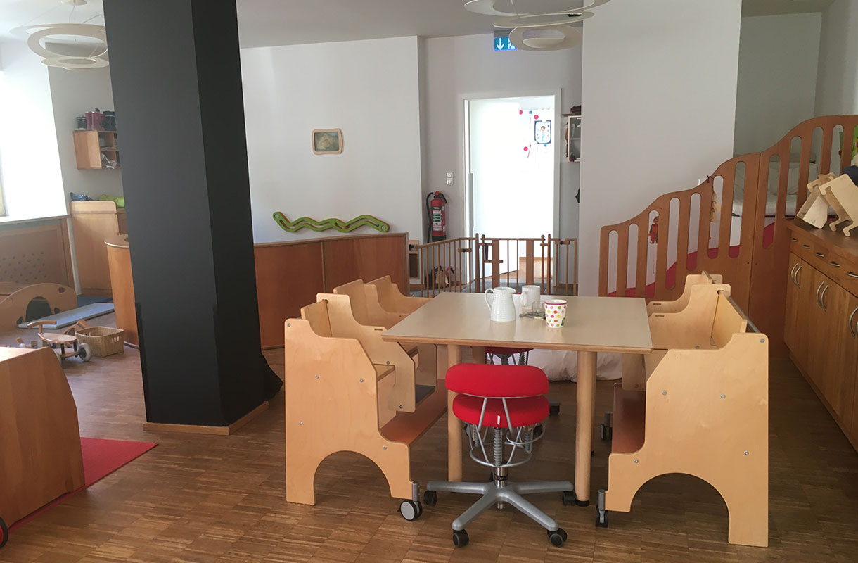 Der Boden des Gruppenraumes ist mit Eicheparkett- geölt und gewachst- ausgelegt, das viele Kindergenerationen erleben wird und einiges aushält. Die Kinder kommen in den Gruppenraum mit einer Küchenzeile aus Buchenholz und einem Ess- und Spielbereich. Sie treffen auf eine vorbereitete Umgebung, die viel Raum und Herausforderung für Bewegung und Spiel zulässt, ausgestattet mit anregenden, vielfältigen und altersangepassten Spielmaterialien.
